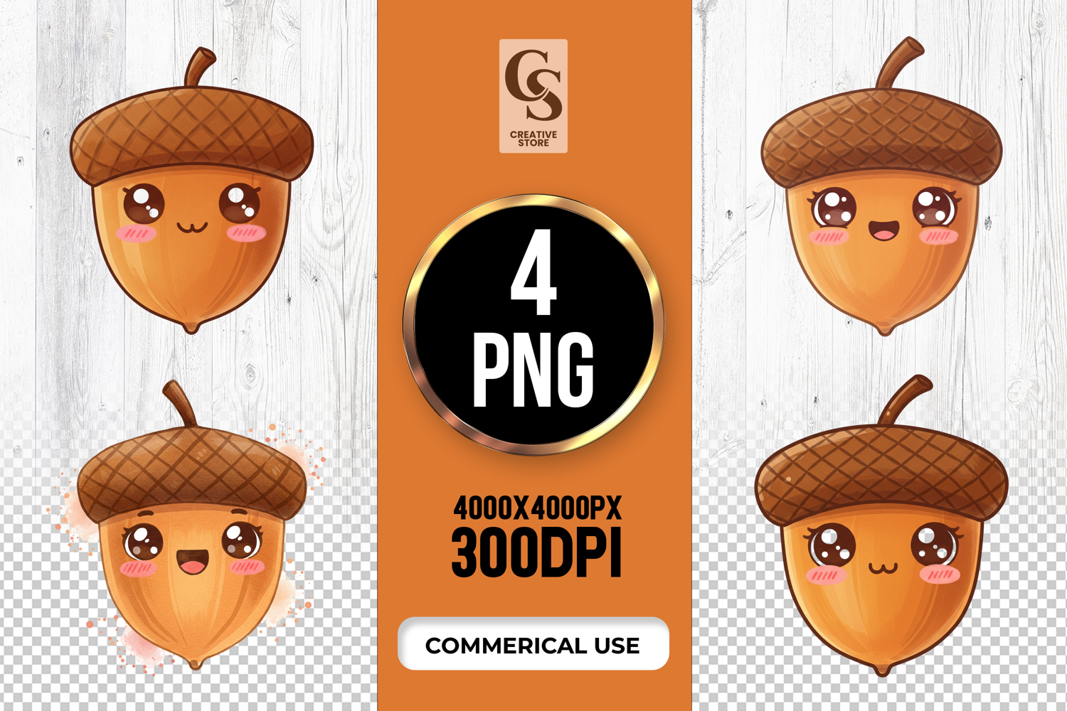 4 Cute Acorn Face Clipart PNG Files Perfect for Greeting Cards, Invitations, Junk Journal, Party Decor, Scrapbooking and many other craft projects.