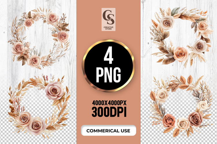 4 Neutral Rose Wreath Clipart PNG Files Perfect for Greeting Cards, Invitations, Junk Journal, Party Decor, Scrapbooking and many other craft projects.