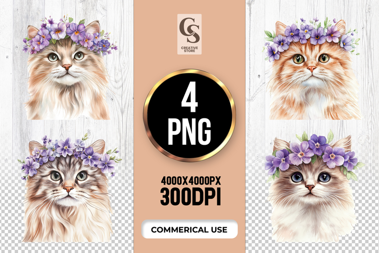 4 Floral Cat Portrait Clipart PNG Files Perfect for Greeting Cards, Invitations, Junk Journal, Party Decor, Scrapbooking and many other craft projects.