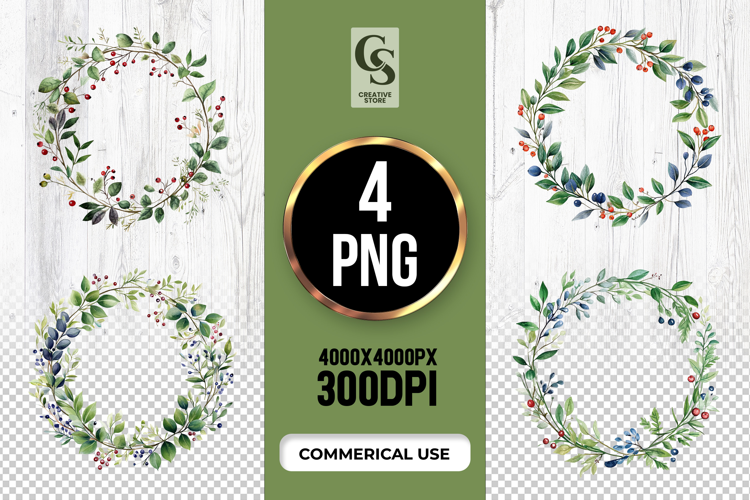 4 Green Leaf Berry Wreath Clipart PNG Files Perfect for Greeting Cards, Invitations, Junk Journal, Party Decor, Scrapbooking and many other craft projects.