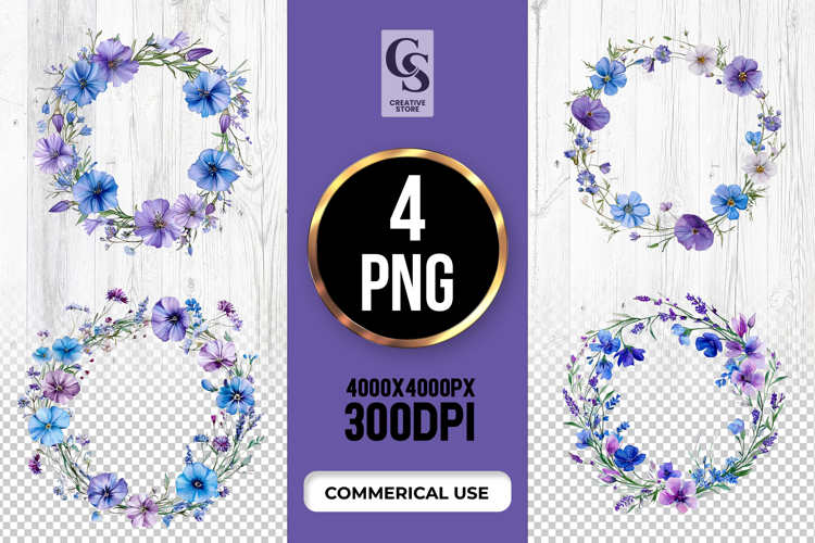 4 Blue Lavender Floral Wreath Clipart PNG Files Perfect for Greeting Cards, Invitations, Junk Journal, Party Decor, Scrapbooking and many other craft projects.