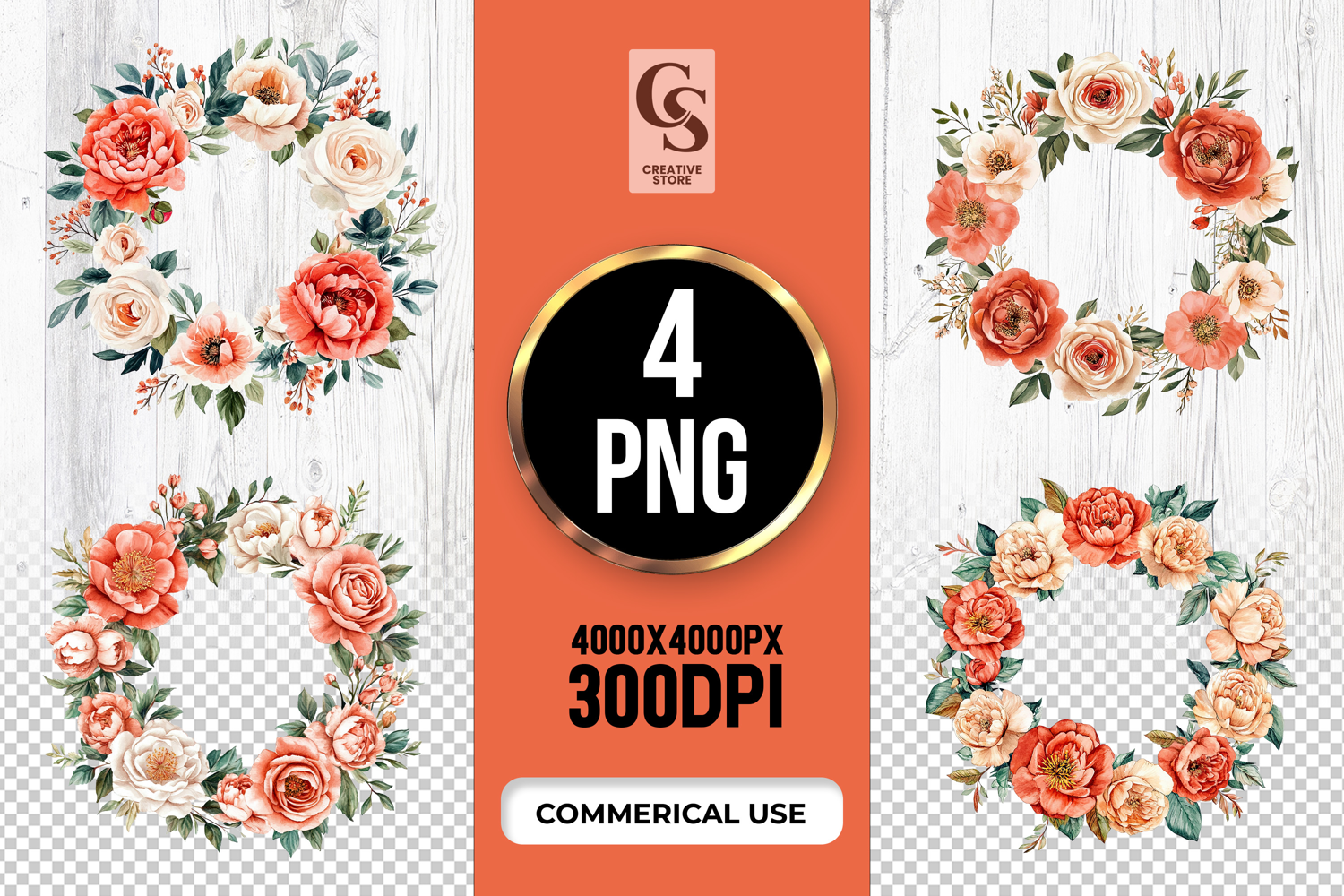 4 Peach Floral Wreath Clipart Sublimation PNG Files Perfect for Greeting Cards, Invitations, Junk Journal, Party Decor, Scrapbooking and many other craft projects.