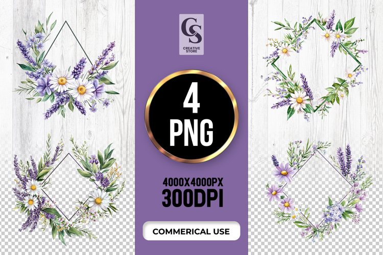 4 Lavender Daisy Frame Clipart Sublimation PNG Files Perfect for Greeting Cards, Invitations, Junk Journal, Party Decor, Scrapbooking and many other craft projects.