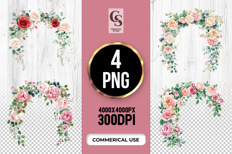 4 Rose Floral Arch Clipart Sublimation PNG Files Perfect for Greeting Cards, Invitations, Junk Journal, Party Decor, Scrapbooking and many other craft projects.