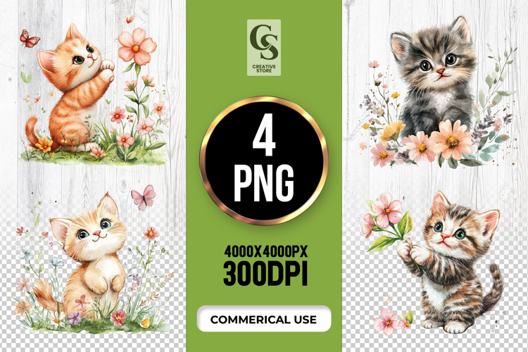 4 Cute Kitten with Flowers Clipart Sublimation PNG Files Perfect for Greeting Cards, Invitations, Junk Journal, Party Decor, Scrapbooking and many other craft projects.
