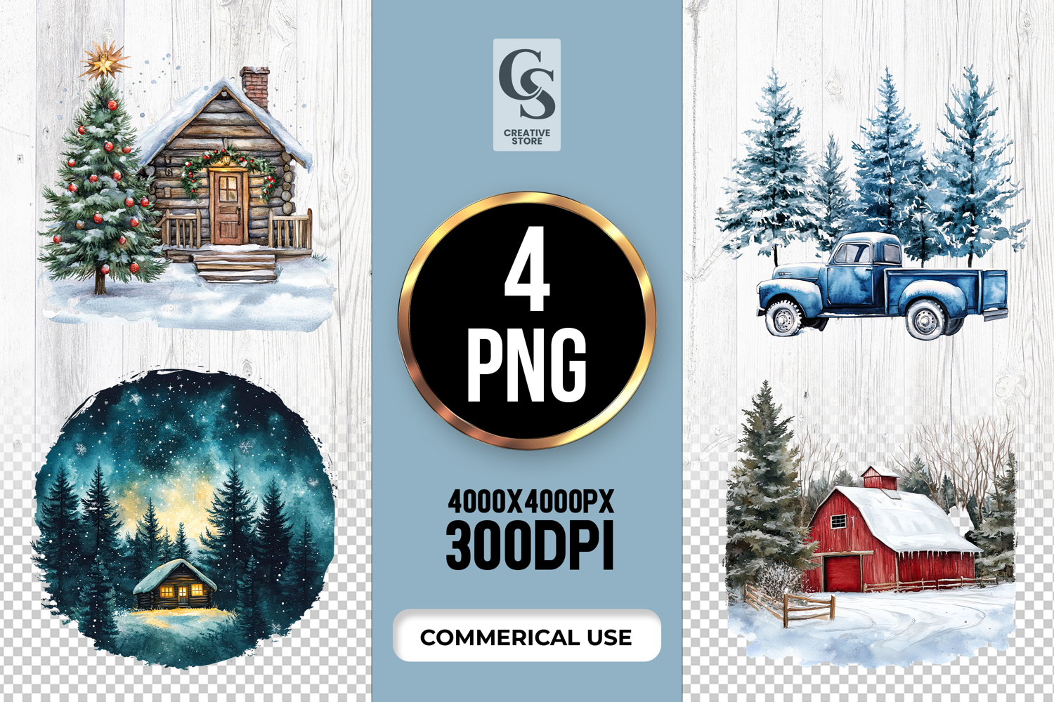 4 Snow Cabin & Winter Truck Clipart Sublimation PNG Files Perfect for Greeting Cards, Invitations, Junk Journal, Party Decor, Scrapbooking and many other craft projects.