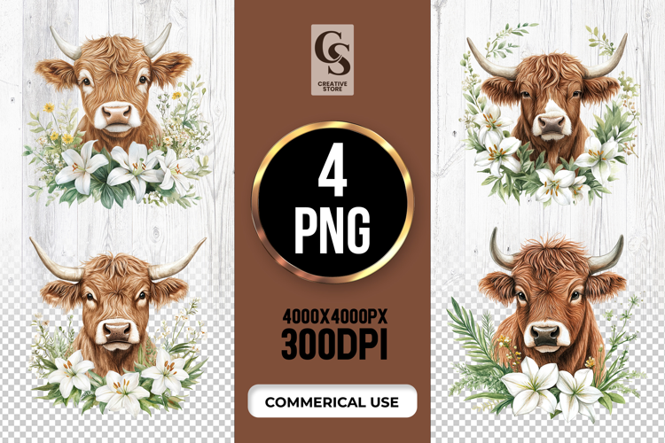 4 White Lily Cow Head Clipart Sublimation PNG Files Perfect for Greeting Cards, Invitations, Junk Journal, Party Decor, Scrapbooking and many other craft projects.