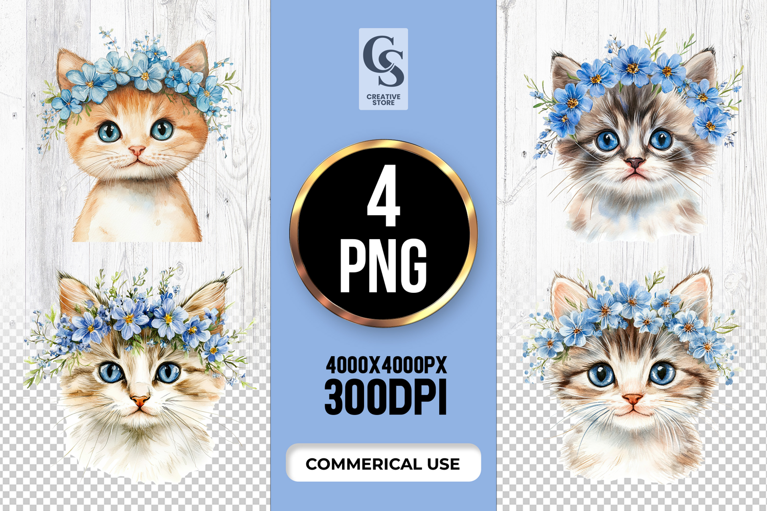 4 Blue Floral Kitten Clipart Sublimation PNG Files Perfect for Greeting Cards, Invitations, Junk Journal, Party Decor, Scrapbooking and many other craft projects.