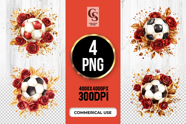 4 Red Rose Soccer Ball Watercolor Clipart Sublimation PNG Files Perfect for Greeting Cards, Invitations, Junk Journal, Party Decor, Scrapbooking and many other craft projects.
