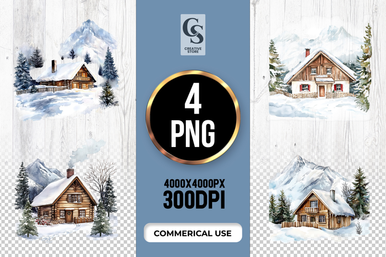 4 Winter Mountain Cabin Clipart Sublimation PNG Files Perfect for Greeting Cards, Invitations, Junk Journal, Party Decor, Scrapbooking and many other craft projects.