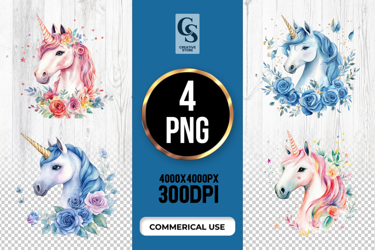 4 Colorful Watercolor Unicorn Clipart Sublimation PNG Files Perfect for Greeting Cards, Invitations, Junk Journal, Party Decor, Scrapbooking and many other craft projects.