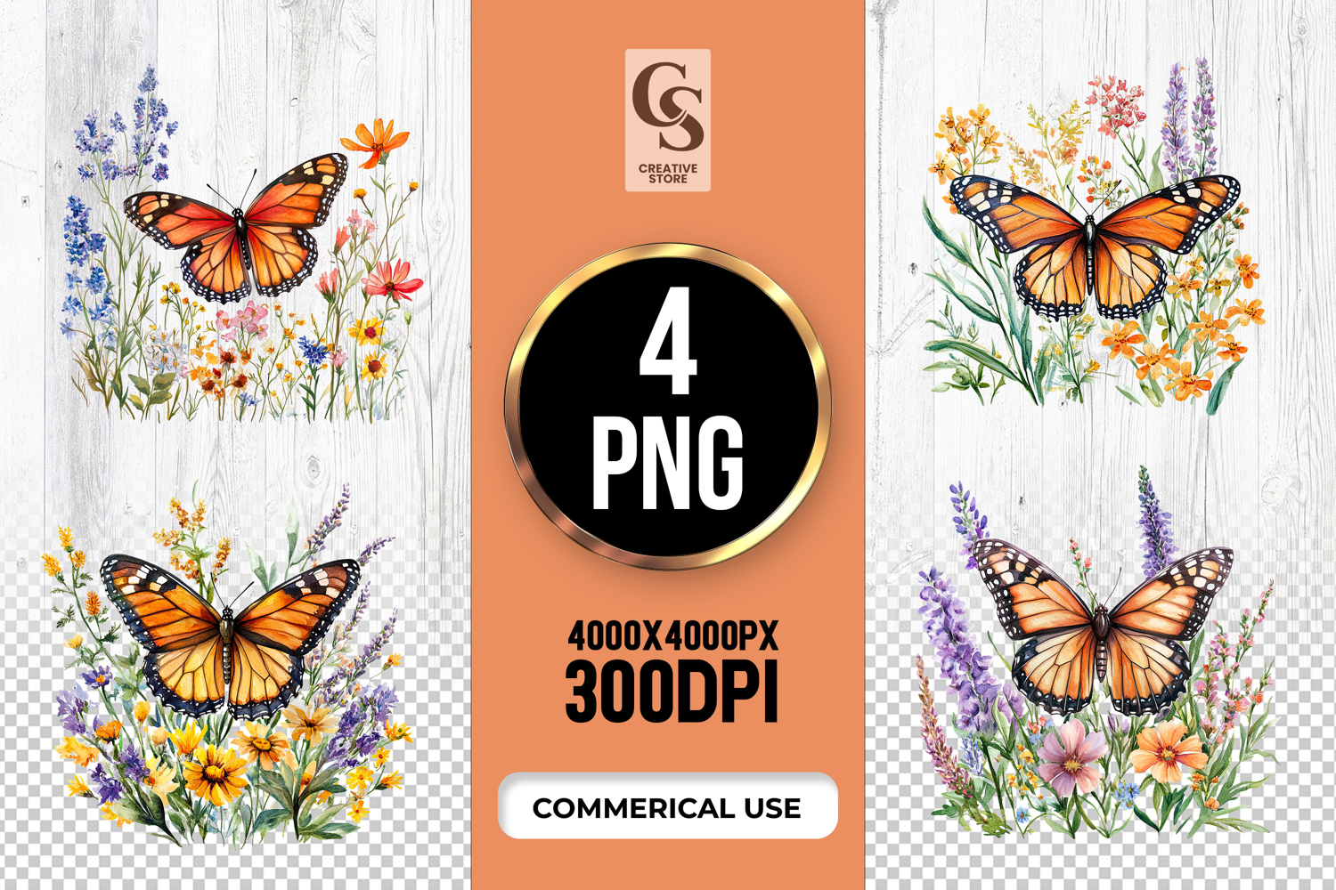 4 Monarch Butterfly Floral Clipart Sublimation PNG Files Perfect for Greeting Cards, Invitations, Junk Journal, Party Decor, Scrapbooking and many other craft projects.