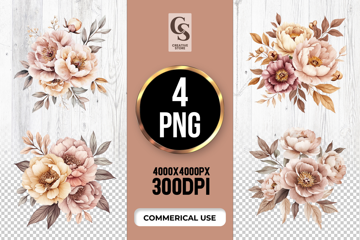 4 Neutral Watercolor Floral Clipart Sublimation PNG Files Perfect for Greeting Cards, Invitations, Junk Journal, Party Decor, Scrapbooking and many other craft projects.