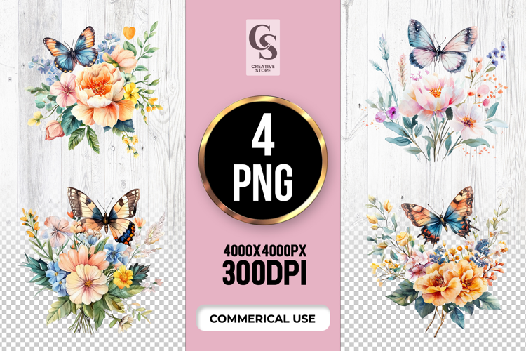 4 Butterfly Floral Bouquet Clipart Sublimation PNG Files Perfect for Greeting Cards, Invitations, Junk Journal, Party Decor, Scrapbooking and many other craft projects.