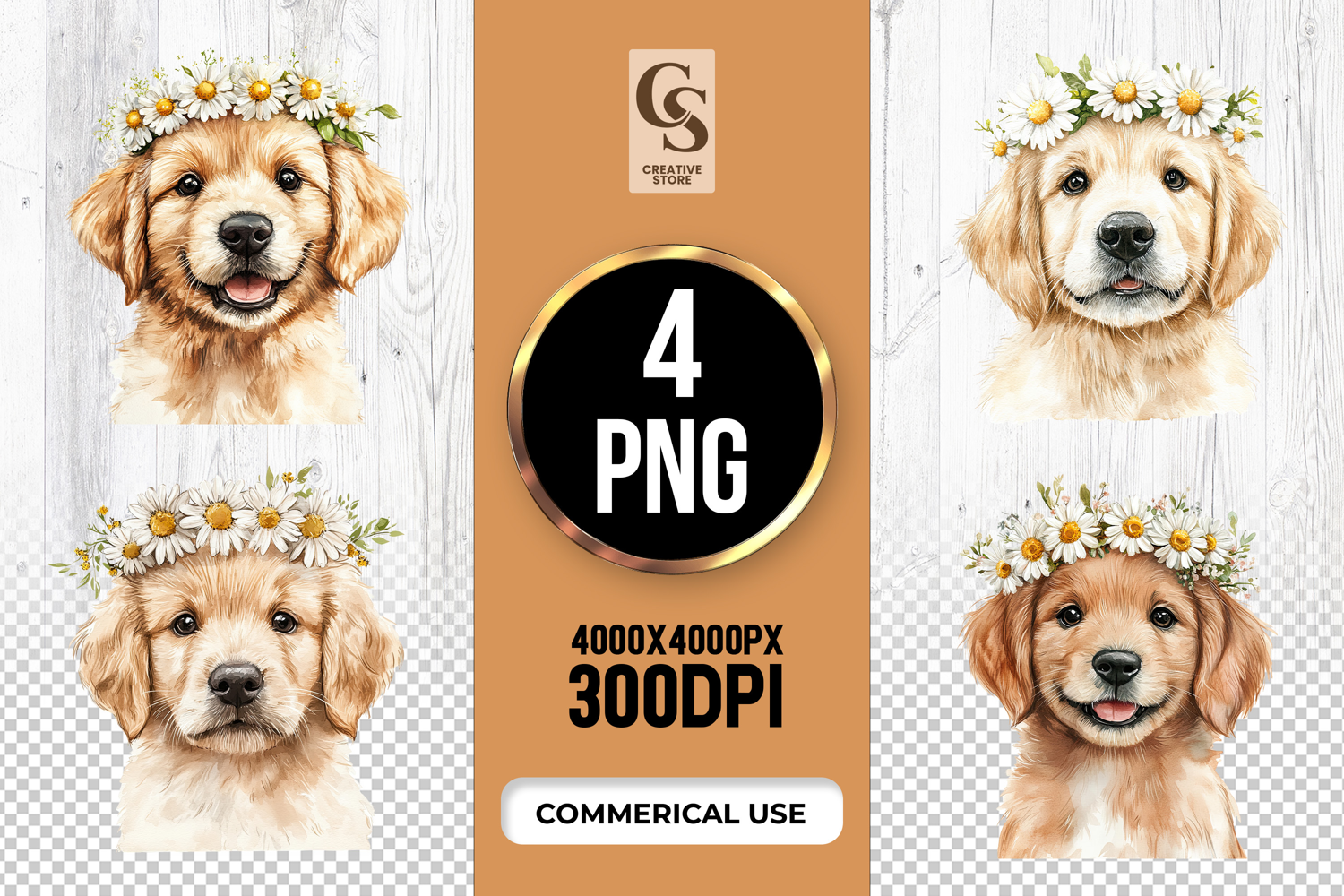 Golden Retriever Clipart Pet Lover Png Floral Dog Sublimation Cute Puppy Png Watercolor Pet Art Realistic Dog Illustration Boho Dog Clipart Daisy Crown Dog Smiling Puppy Png Adorable Retriever Sublimation
