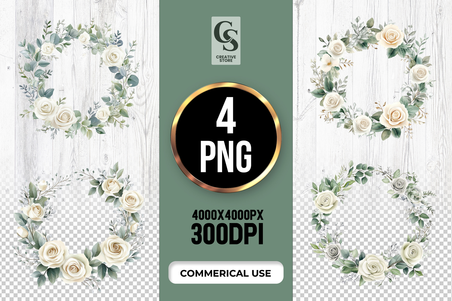 4 White Rose Eucalyptus Wreath Clipart Sublimation PNG Files Perfect for Greeting Cards, Invitations, Junk Journal, Party Decor, Scrapbooking and many other craft projects.