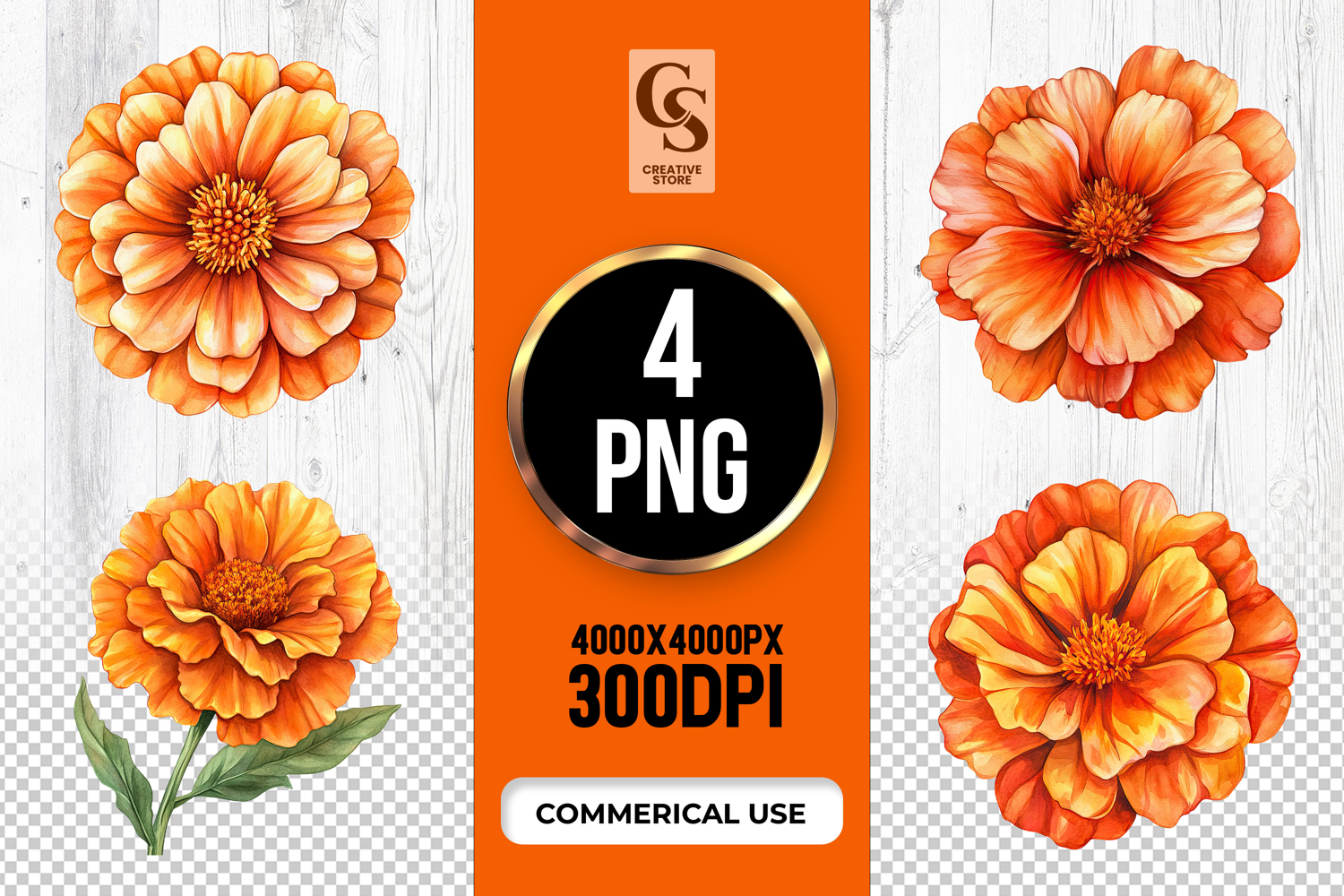 4 Orange Marigold Flower Clipart Sublimation PNG Files Perfect for Greeting Cards, Invitations, Junk Journal, Party Decor, Scrapbooking and many other craft projects.
