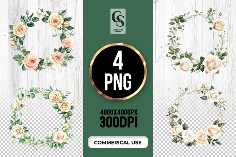 4 Cream Rose Wreath Clipart Sublimation PNG Files Perfect for Greeting Cards, Invitations, Junk Journal, Party Decor, Scrapbooking and many other craft projects.