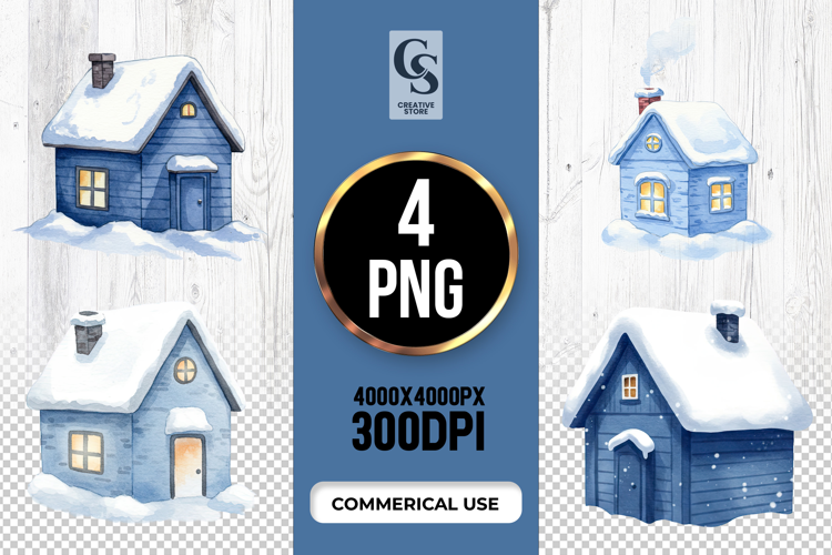 4 Blue Winter Cabin Clipart Sublimation PNG Files Perfect for Greeting Cards, Invitations, Junk Journal, Party Decor, Scrapbooking and many other craft projects.