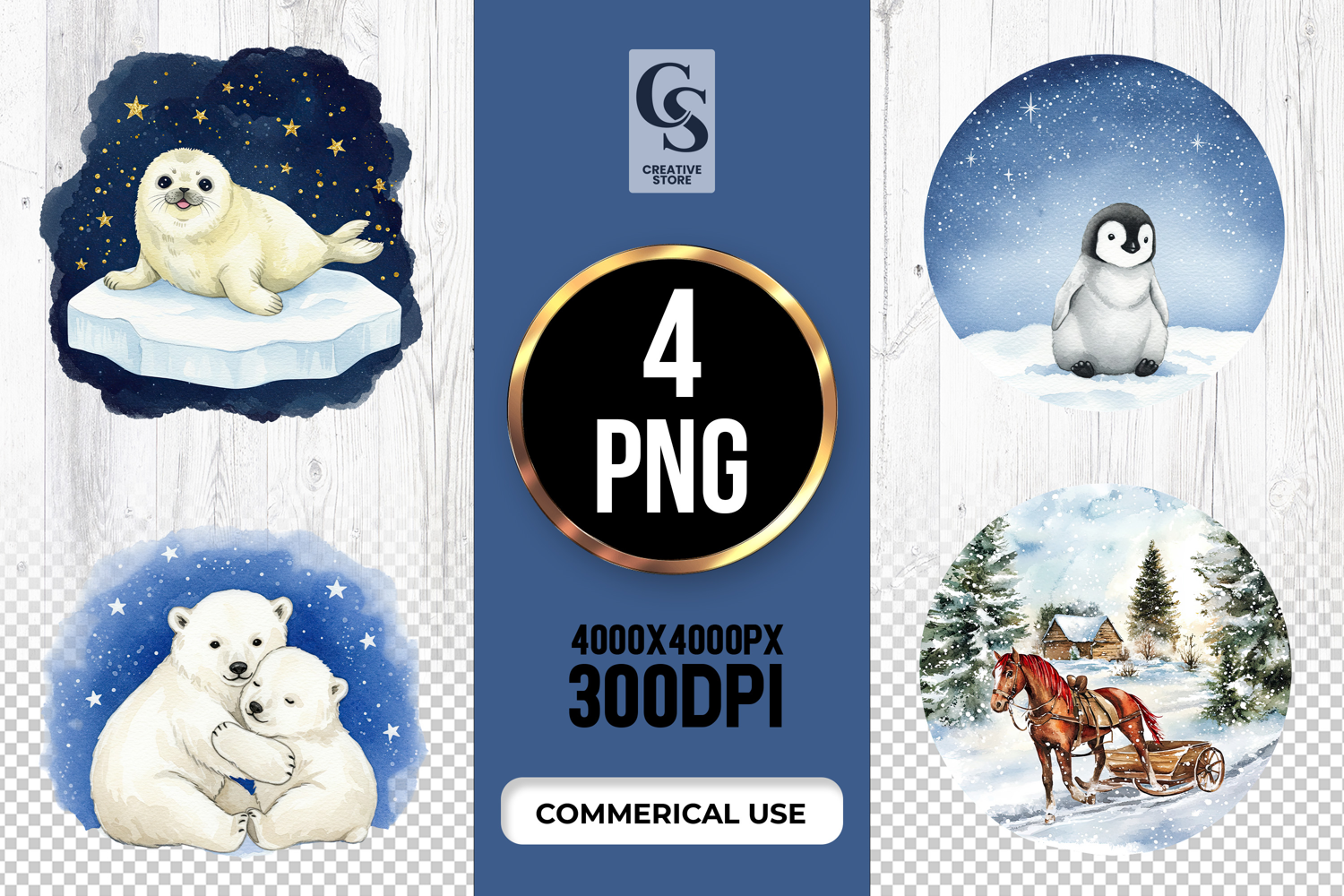 Winter Animal Clipart Cute Polar Bears Cozy Village Clipart Watercolor Winter Art Penguin Art Png Baby Seal Illustration Snowy Horse Scene Cold Season Design Wildlife Snow Artwork Arctic Watercolor Sublimation