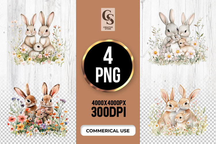 4 Floral Bunny Family Clipart Sublimation PNG Files Perfect for Greeting Cards, Invitations, Junk Journal, Party Decor, Scrapbooking and many other craft projects.