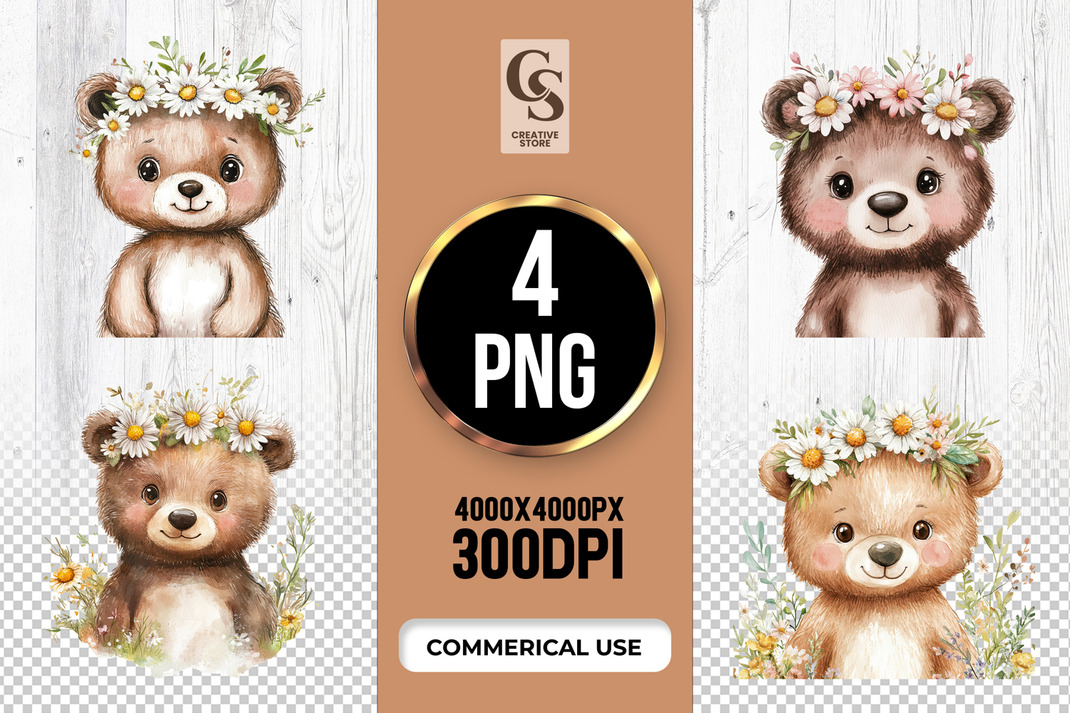 4 Floral Bear Clipart Sublimation PNG Files Perfect for Greeting Cards, Invitations, Junk Journal, Party Decor, Scrapbooking and many other craft projects.