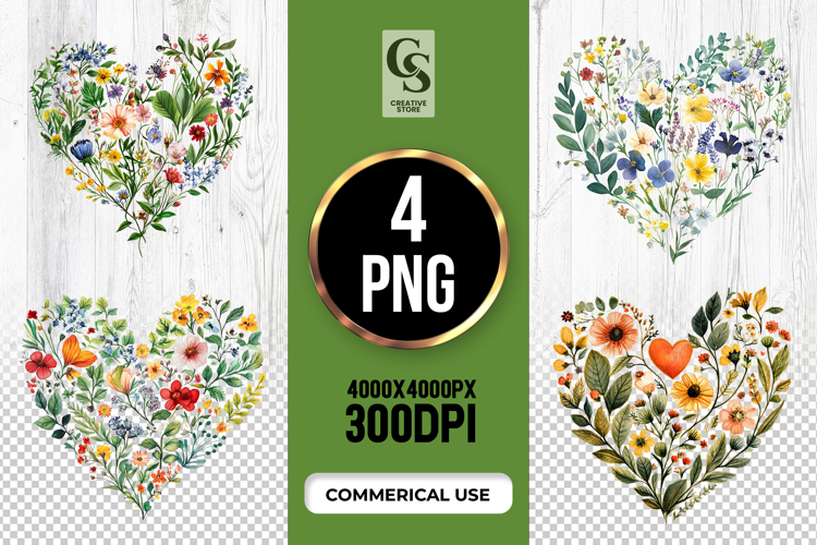 4 Wildflower Heart Floral Clipart Sublimation PNG Files Perfect for Greeting Cards, Invitations, Junk Journal, Party Decor, Scrapbooking and many other craft projects.