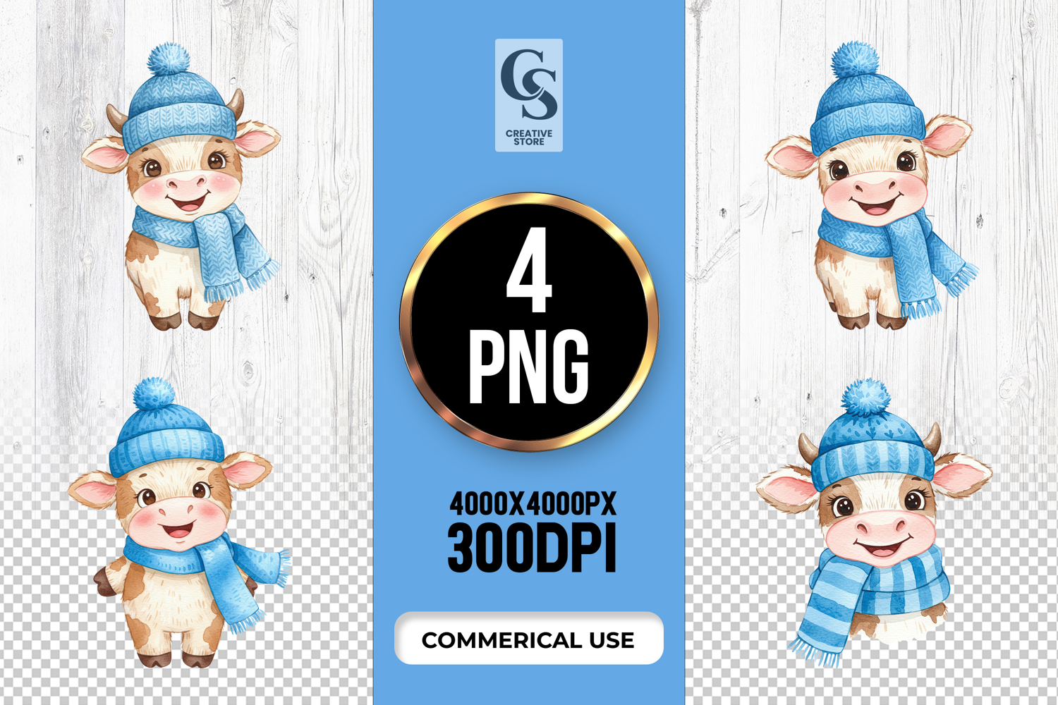 Farm Animal Clipart Baby Cow Png Cute Calf Png Watercolor Cow Art Winter Cow Clipart Adorable Cow Clipart Cartoon Calf Sublimation Cozy Cow Sublimation Blue Hat Cow Winter Farm Design