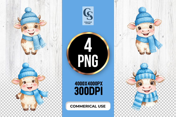 4 Cute Winter Cow Clipart Sublimation PNG Files Perfect for Greeting Cards, Invitations, Junk Journal, Party Decor, Scrapbooking and many other craft projects.