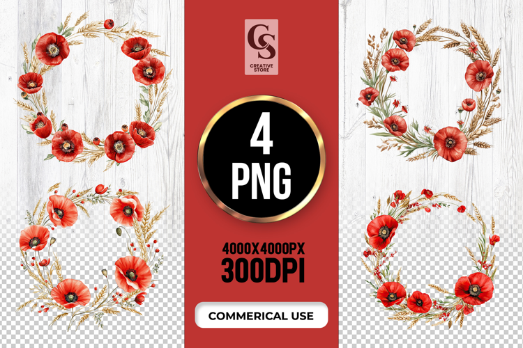 4 Red Poppy Floral Wreath Clipart Sublimation PNG Files Perfect for Greeting Cards, Invitations, Junk Journal, Party Decor, Scrapbooking and many other craft projects.