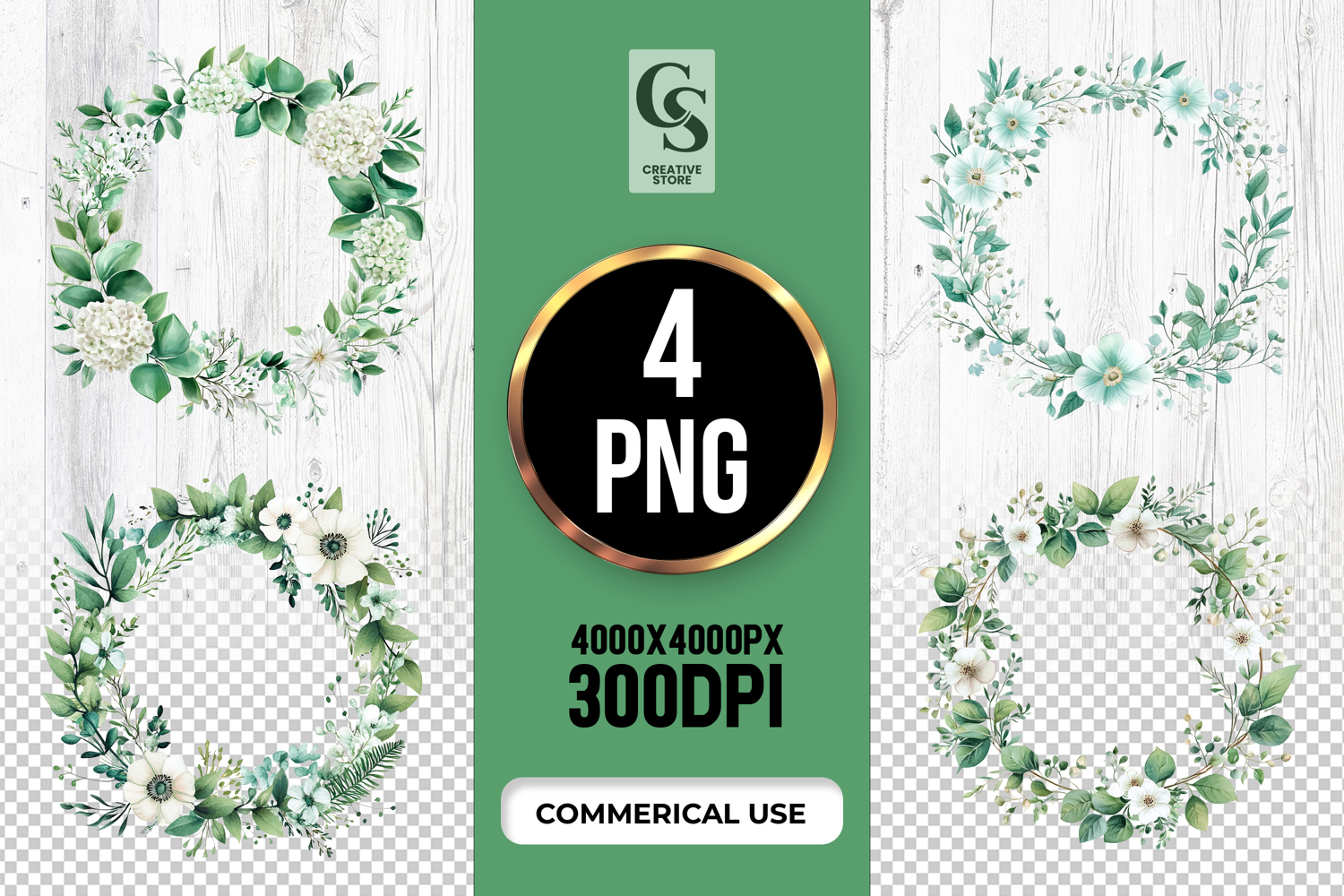 4 Green Floral Wreath Clipart Sublimation PNG Files Perfect for Greeting Cards, Invitations, Junk Journal, Party Decor, Scrapbooking and many other craft projects.