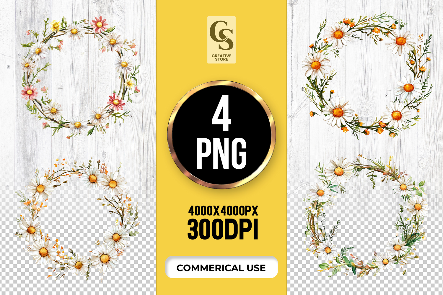4 Daisy Wildflower Wreath Clipart Sublimation PNG Files Perfect for Greeting Cards, Invitations, Junk Journal, Party Decor, Scrapbooking and many other craft projects.