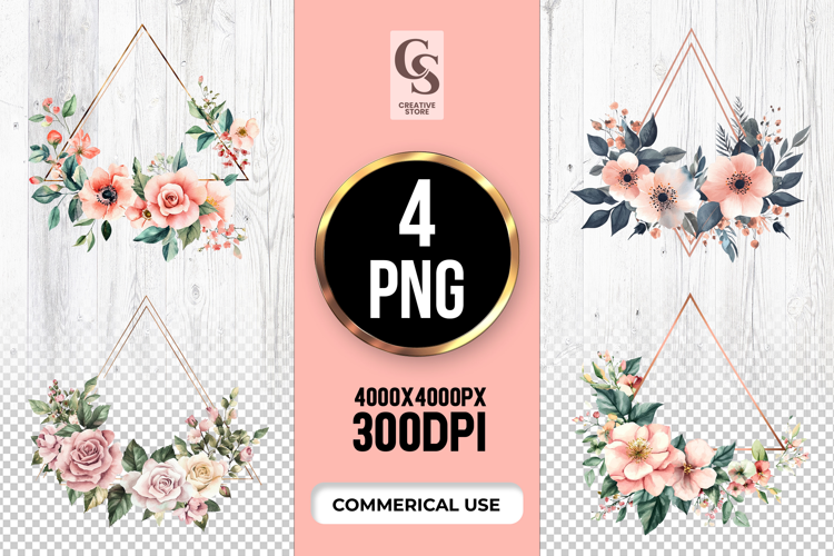 4 Blush Floral Triangle Frame Clipart Sublimation PNG Files Perfect for Greeting Cards, Invitations, Junk Journal, Party Decor, Scrapbooking and many other craft projects.