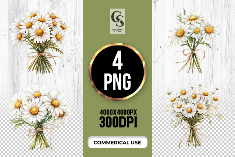 4 Daisy Flower Bouquet Clipart Sublimation PNG Files Perfect for Greeting Cards, Invitations, Junk Journal, Party Decor, Scrapbooking and many other craft projects.