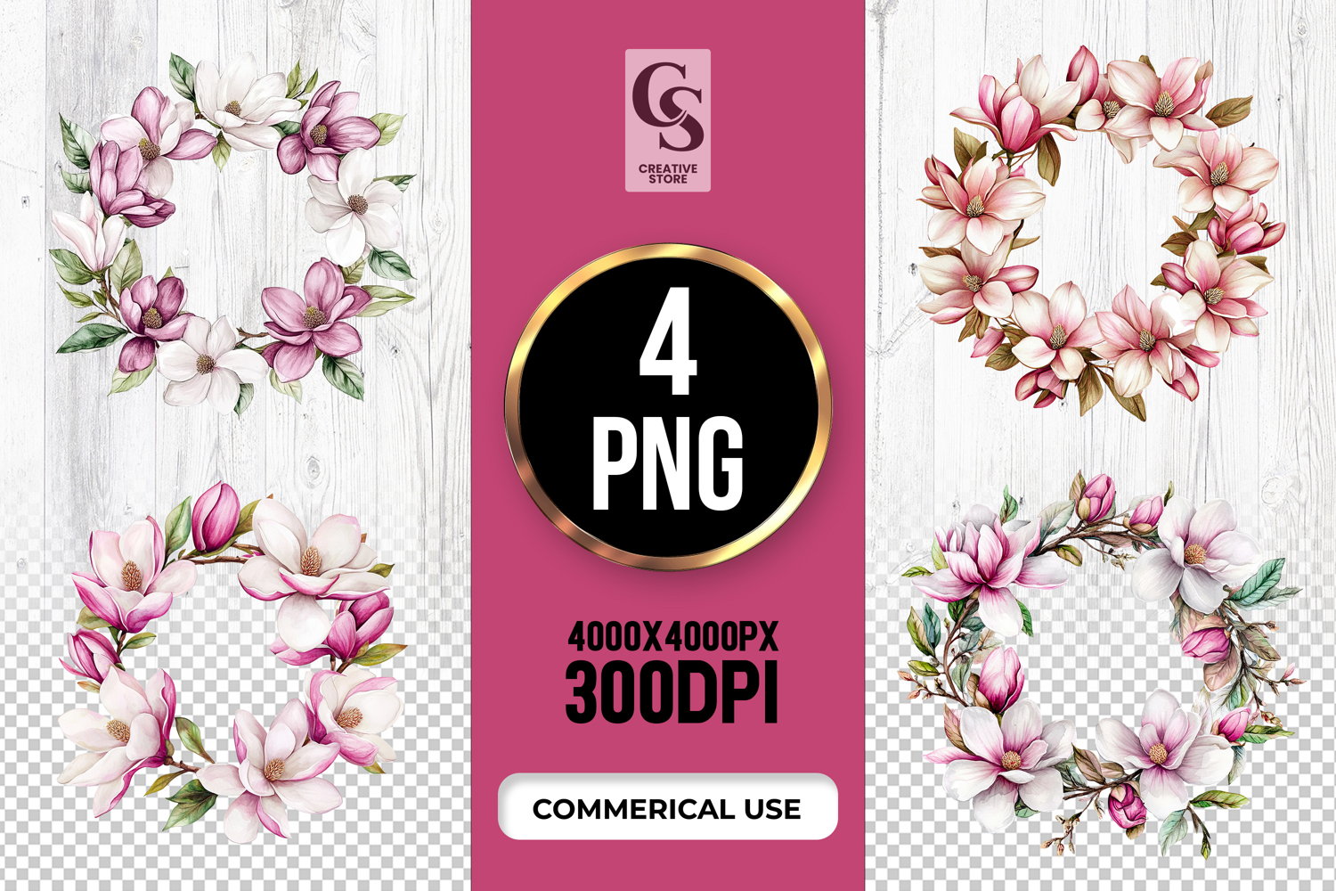 4 Magnolia Flower Wreath Clipart Sublimation PNG Files Perfect for Greeting Cards, Invitations, Junk Journal, Party Decor, Scrapbooking and many other craft projects.