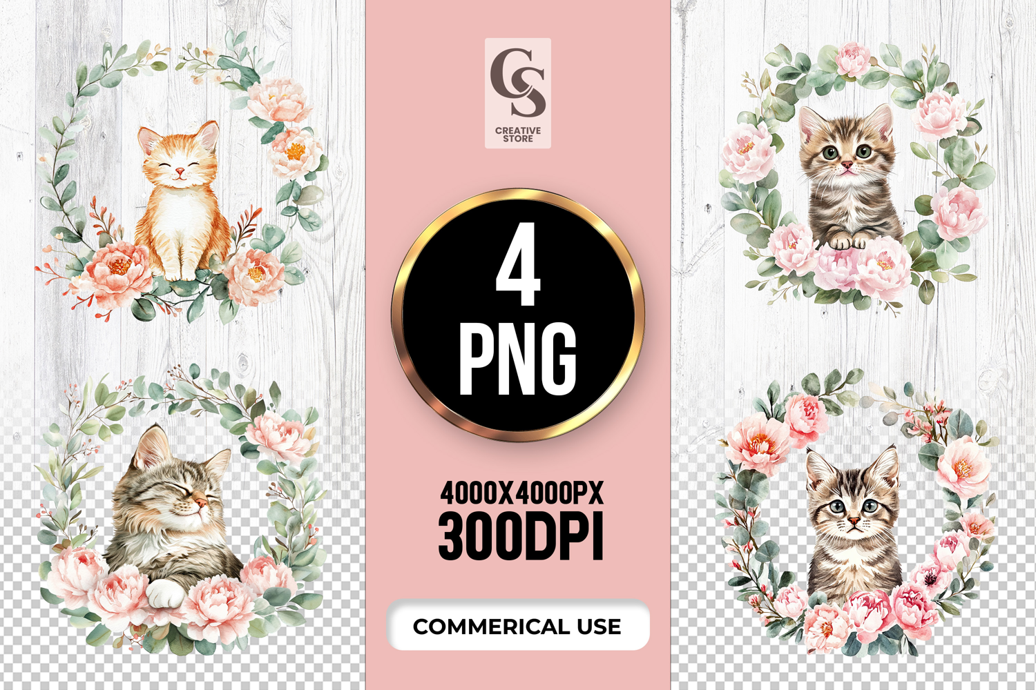 4 Floral Kitten Clipart Sublimation PNG Files Perfect for Greeting Cards, Invitations, Junk Journal, Party Decor, Scrapbooking and many other craft projects.