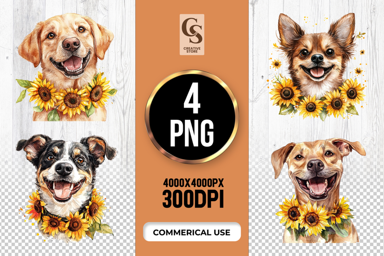 4 Sunflower Dog Head Floral Clipart Sublimation PNG Files Perfect for Greeting Cards, Invitations, Junk Journal, Party Decor, Scrapbooking and many other craft projects.