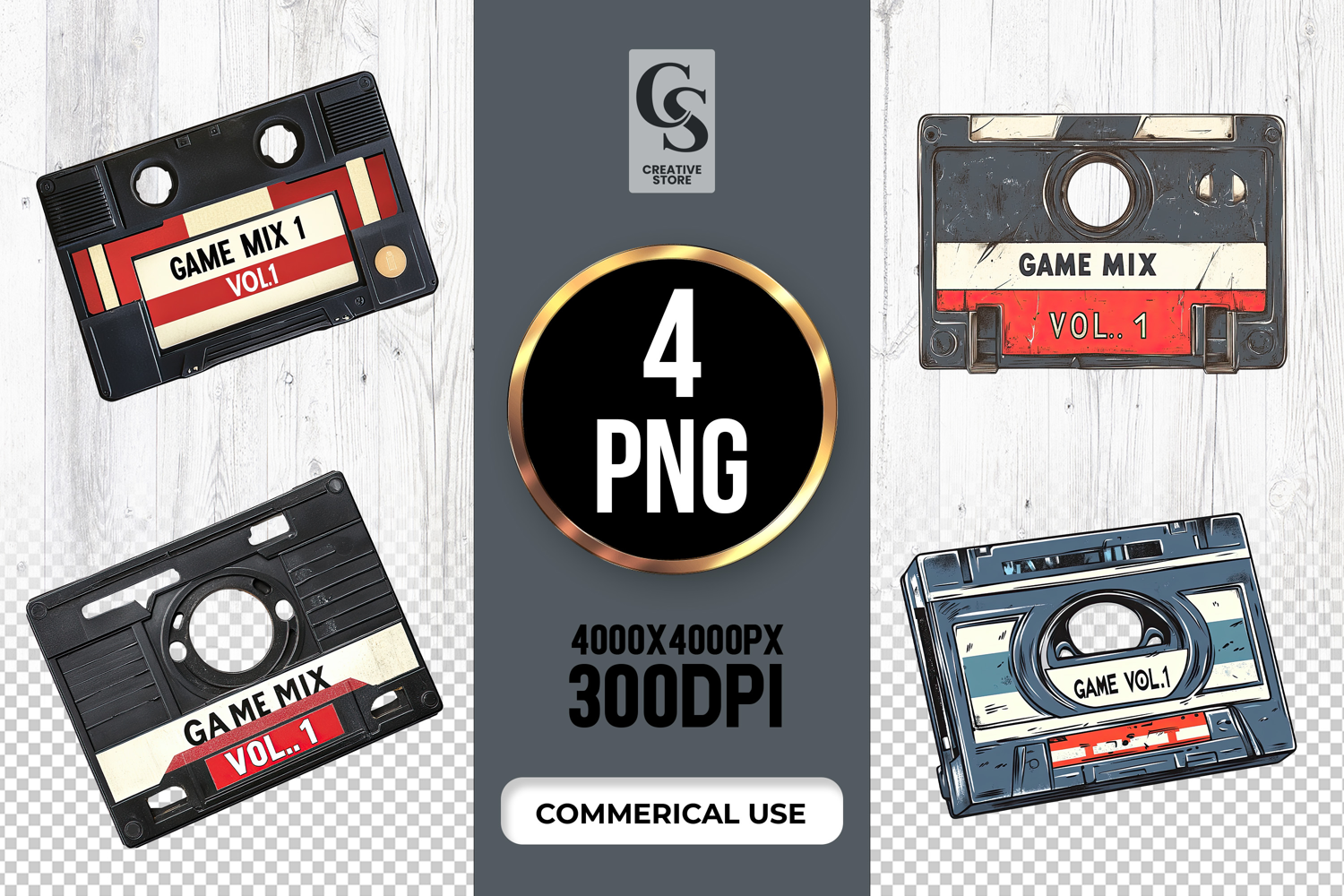 4 Retro Game Cassette Tape Clipart Sublimation PNG Files Perfect for Greeting Cards, Invitations, Junk Journal, Party Decor, Scrapbooking and many other craft projects.