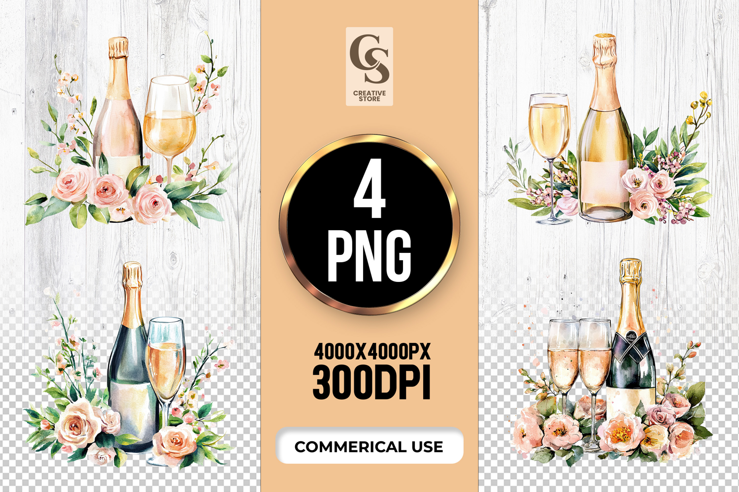 4 Elegant Champagne Bottle Floral Clipart Sublimation PNG Files Perfect for Greeting Cards, Invitations, Junk Journal, Party Decor, Scrapbooking and many other craft projects.