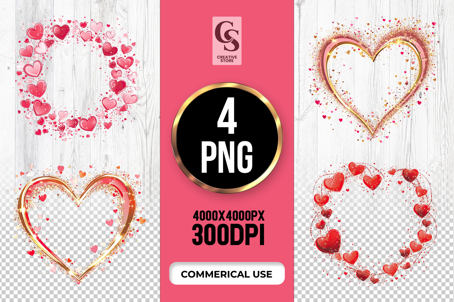 4 Gold Red Heart Frame Clipart Sublimation PNG Files Perfect for Greeting Cards, Invitations, Junk Journal, Party Decor, Scrapbooking and many other craft projects.