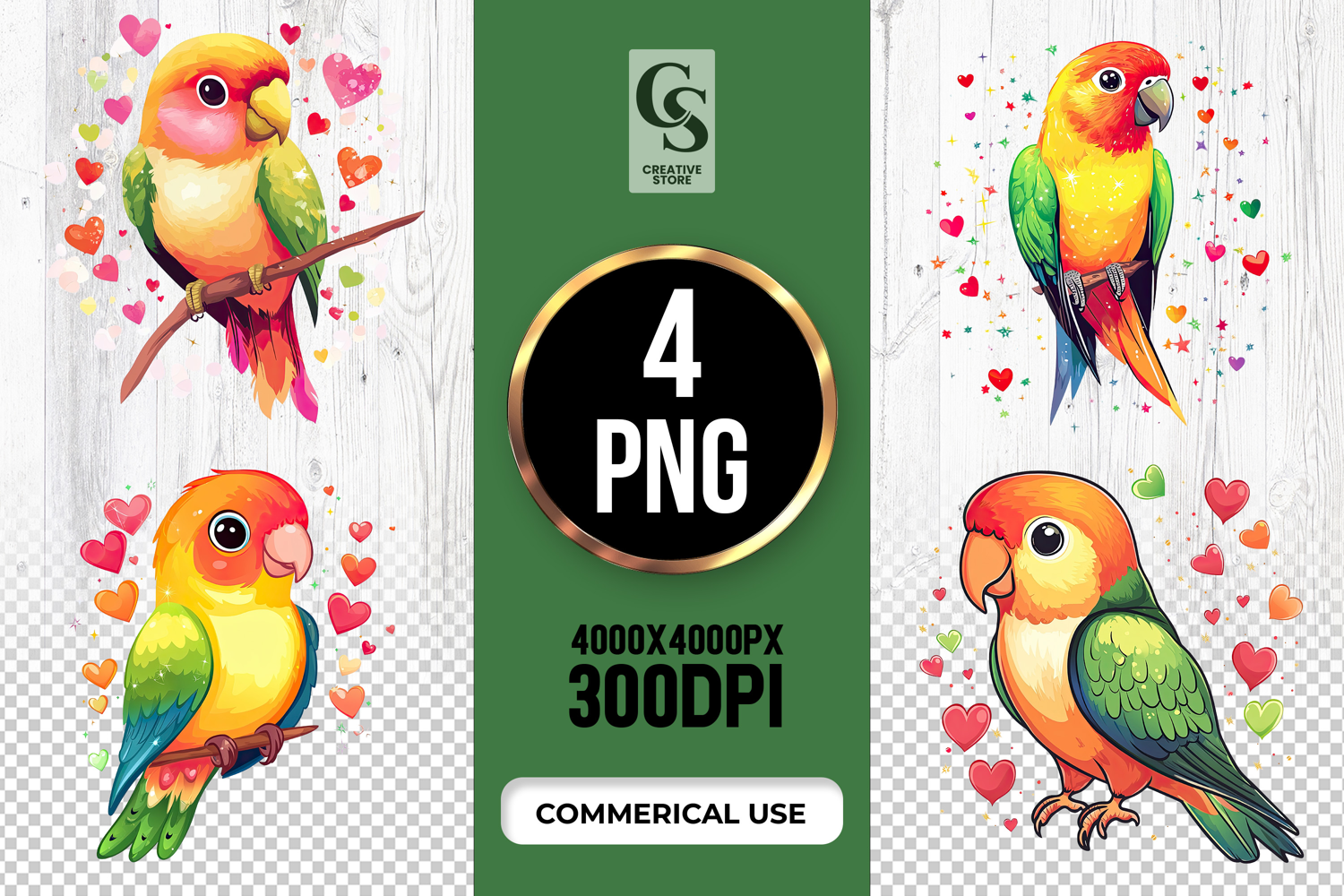 4 Colorful Lovebird Parrot Clipart Sublimation PNG Files Perfect for Greeting Cards, Invitations, Junk Journal, Party Decor, Scrapbooking and many other craft projects.