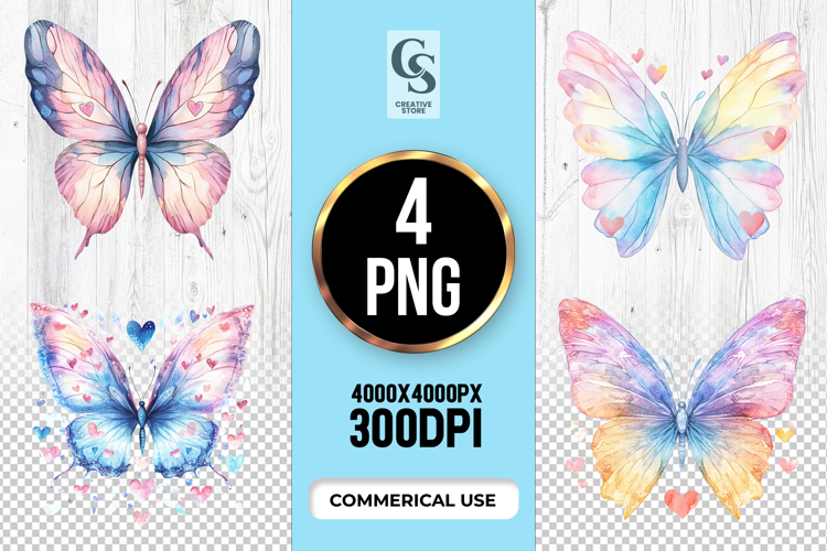 4 Watercolor Rainbow Butterfly Clipart Sublimation PNG Files Perfect for Greeting Cards, Invitations, Junk Journal, Party Decor, Scrapbooking and many other craft projects.