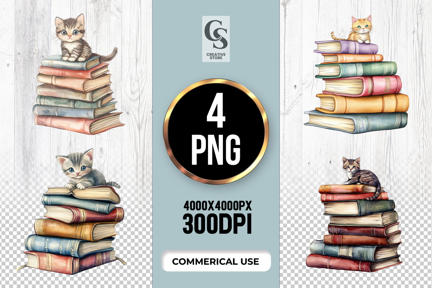 4 Cute Cat on Vintage Books Clipart PNG Files Perfect for Greeting Cards, Invitations, Junk Journal, Party Decor, Scrapbooking and many other craft projects.