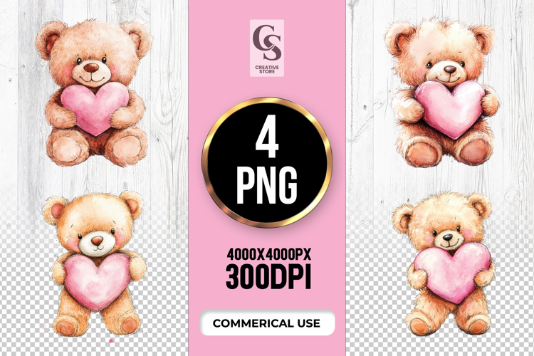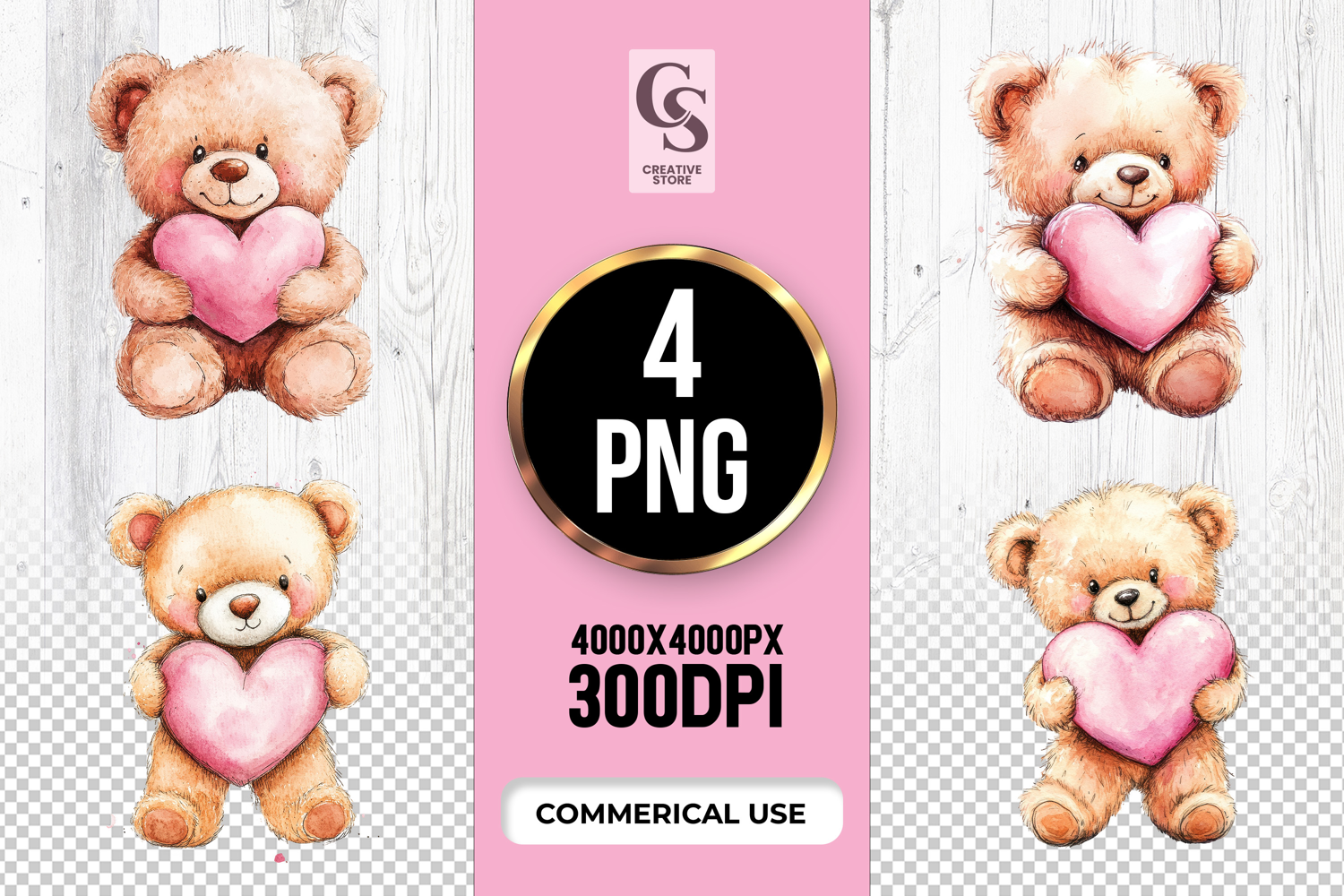 4 Cute Teddy Bear Holding Heart Clipart Sublimation PNG Files Perfect for Greeting Cards, Invitations, Junk Journal, Party Decor, Scrapbooking and many other craft projects.