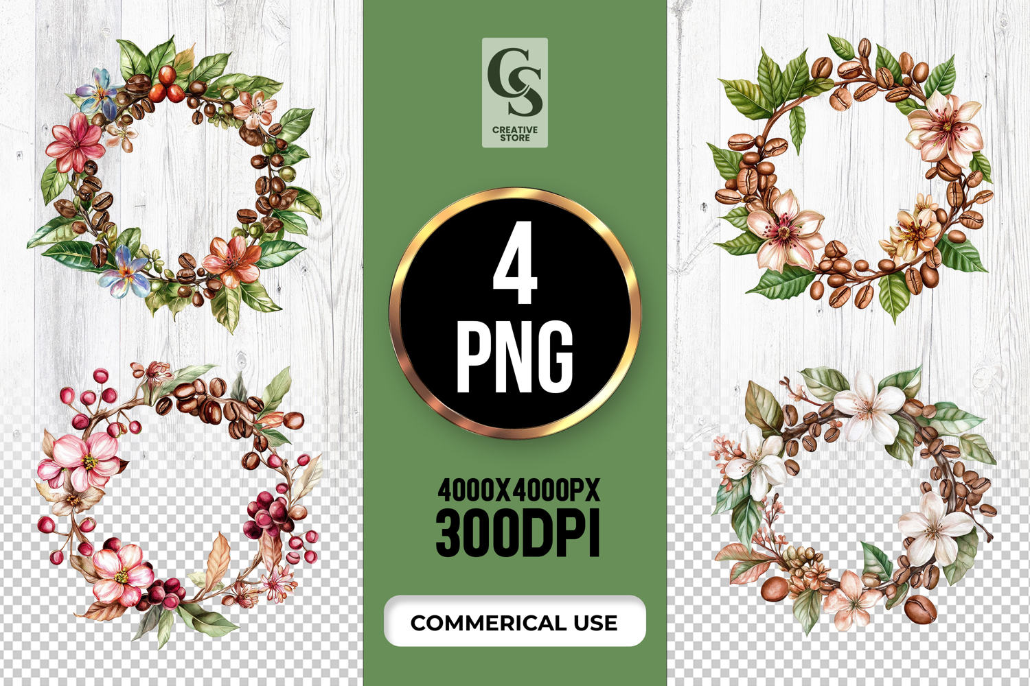 4 Coffee Bean Floral Wreath Clipart Sublimation PNG Files Perfect for Greeting Cards, Invitations, Junk Journal, Party Decor, Scrapbooking and many other craft projects.
