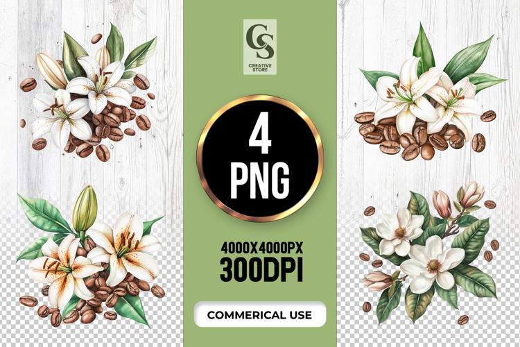 4 White Lily Coffee Bean Floral Clipart Sublimation PNG Files Perfect for Greeting Cards, Invitations, Junk Journal, Party Decor, Scrapbooking and many other craft projects.