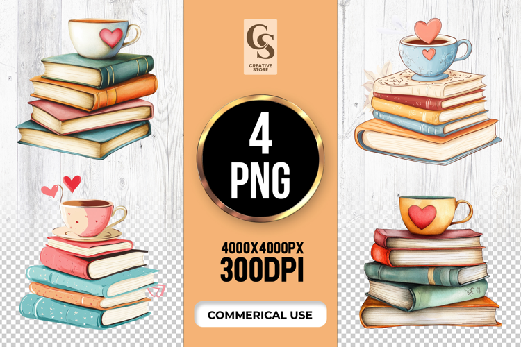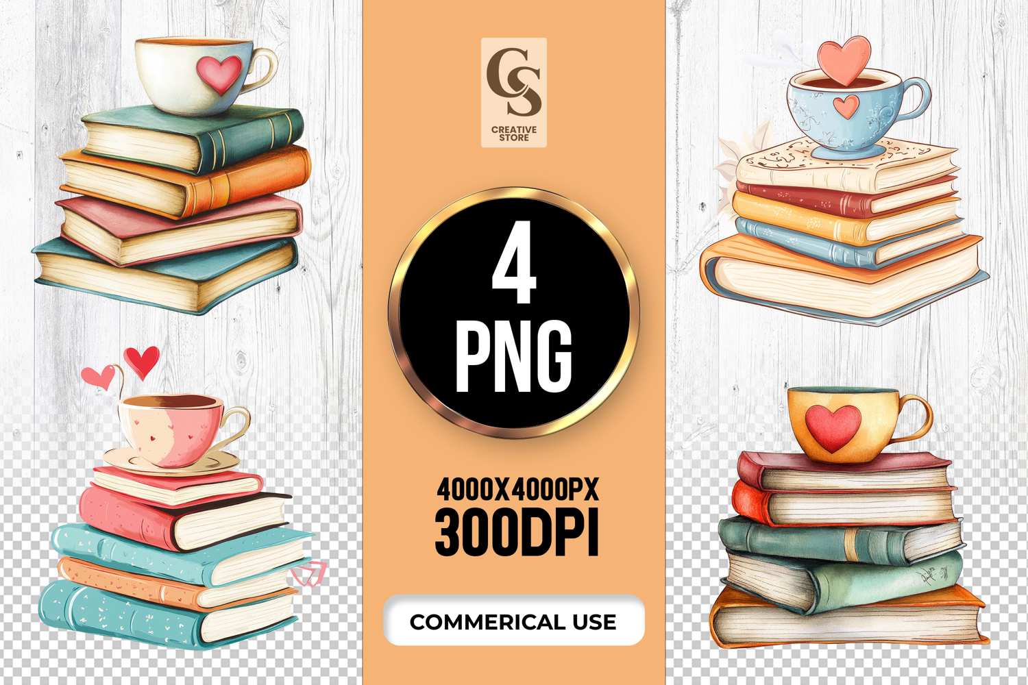 4 Coffee Cup Book Stack Clipart Sublimation PNG Files Perfect for Greeting Cards, Invitations, Junk Journal, Party Decor, Scrapbooking and many other craft projects.