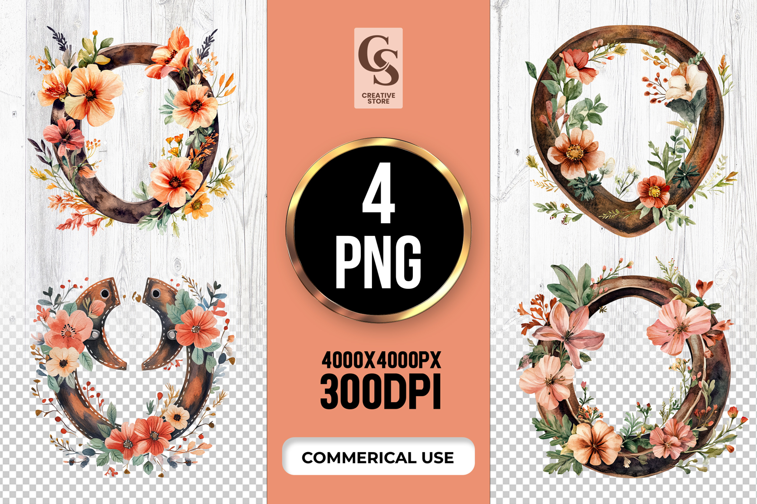 4 Floral Horseshoe Wreath Clipart Sublimation PNG Files Perfect for Greeting Cards, Invitations, Junk Journal, Party Decor, Scrapbooking and many other craft projects.
