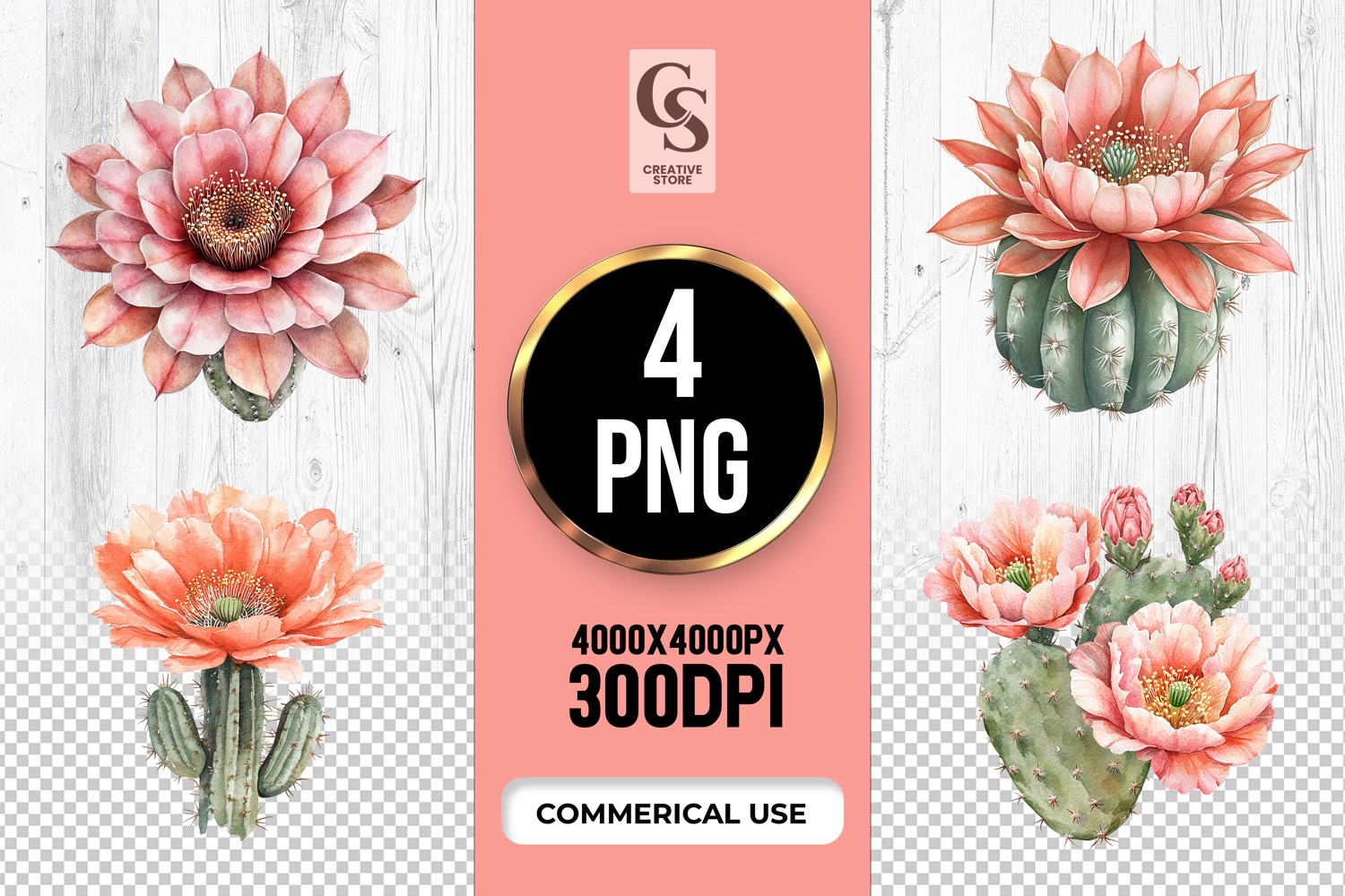 4 Cactus Flower Blossom Clipart Sublimation PNG Files Perfect for Greeting Cards, Invitations, Junk Journal, Party Decor, Scrapbooking and many other craft projects.