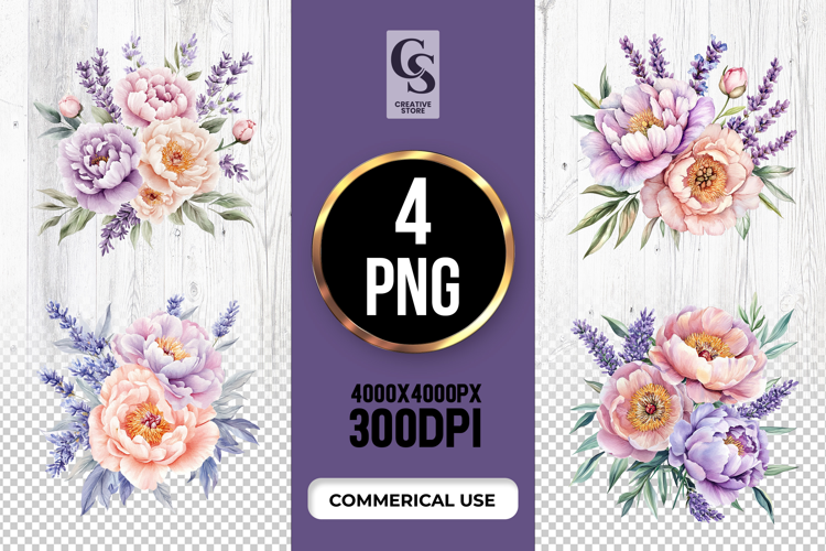 Floral Clipart Watercolor Bouquet Botanical Clipart Lavender Png Vintage Flower Illustration Garden Flower Png Purple Floral Design Peony Flower Art Soft Pastel Florals Elegant Peony Sublimation